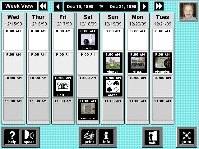 DetailsPicture Planner has three main views: the Day View, the Week View, and the Month View. You use these views to look at, build, and change your activities. When Picture Planner starts, it takes you to the Week View. Click on the graphic below to see a full-size version of the Week View. To build an activity you first select a time by clicking once in a square. Each of the squares in the Week View shown above represents a one-hour block of time. Suppose you wanted to build a new activity on Saturday at 9:00 a.m. right after bowling. You would click once on the 9:00 icon. Picture Planner asks what type of activity you'd like to build by presenting you with all of your activity icons. After you've selected a type of activity, a What, in Picture Planner's terms, you can add items in the other categories (Who, Where, How, Cost, Bring, Clothes). More specifically the categories are: Who will be doing the activity with you?, Where will the activity take place?, How will you get there?, What does the activity Cost?, What should you Bring?, and What Clothes should you wear? You may add as many items in each category as you would like. Visit our Help section, especially the Using Picture Planner section, to learn more about the features of Picture Planner.