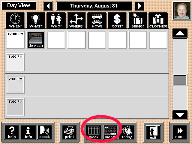 Help > Using > Changing ViewsTo change between the Day, Week, and Month Views, click on the buttons in highlighted in red in the image below. If you are in the Day View, the buttons say "Week" and "Month." If you are in the Week View, the buttons say "Day" and "Month." If you are in the Month View, the buttons say "Day" and "Week." Day View