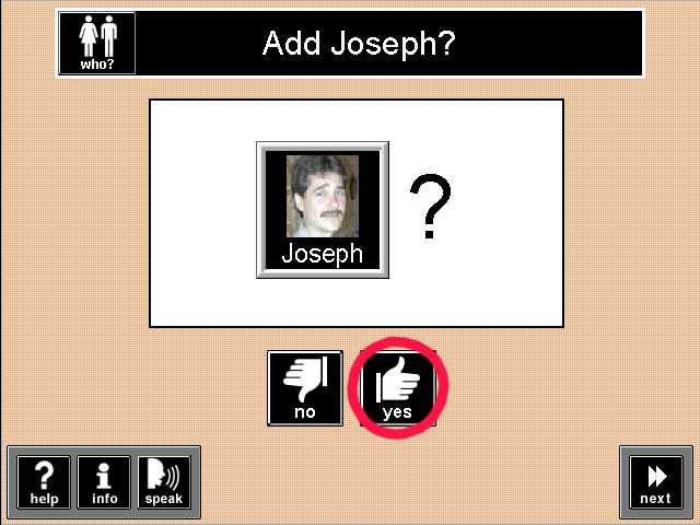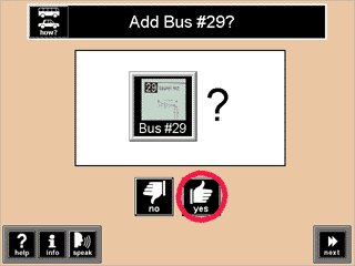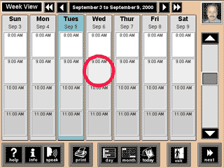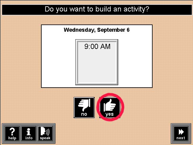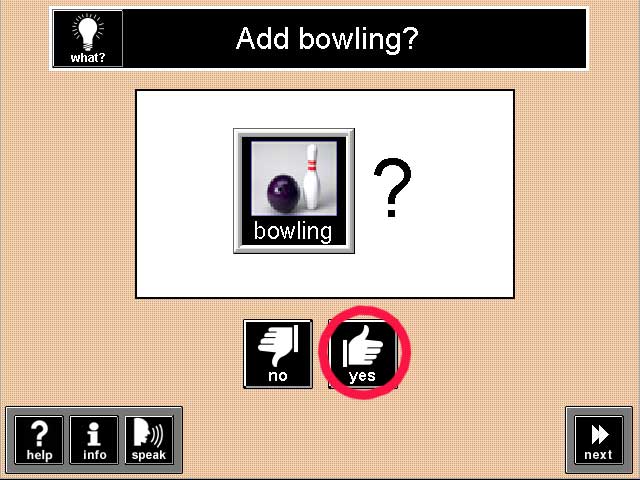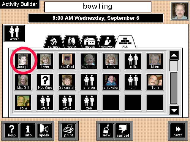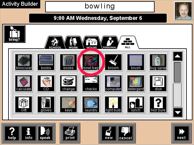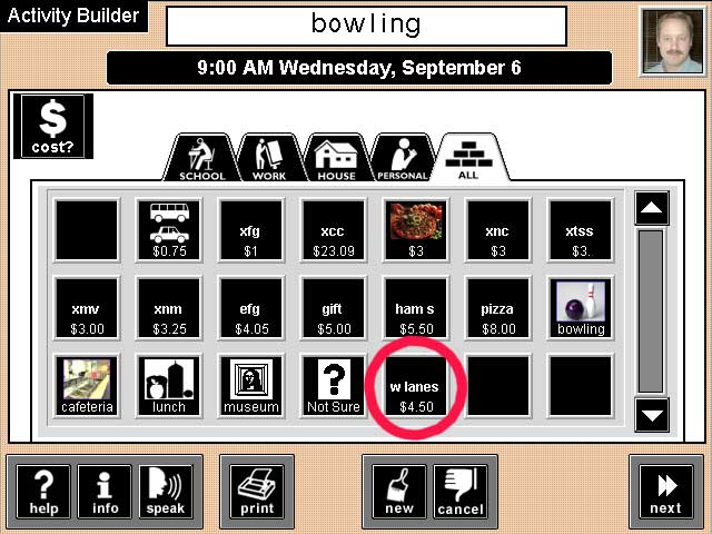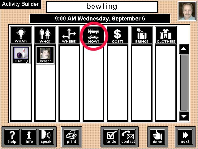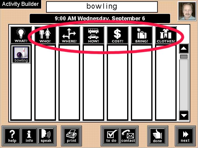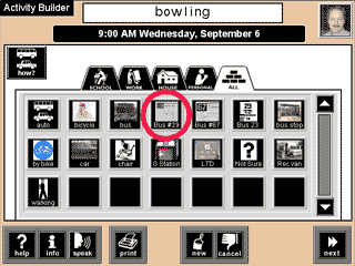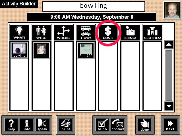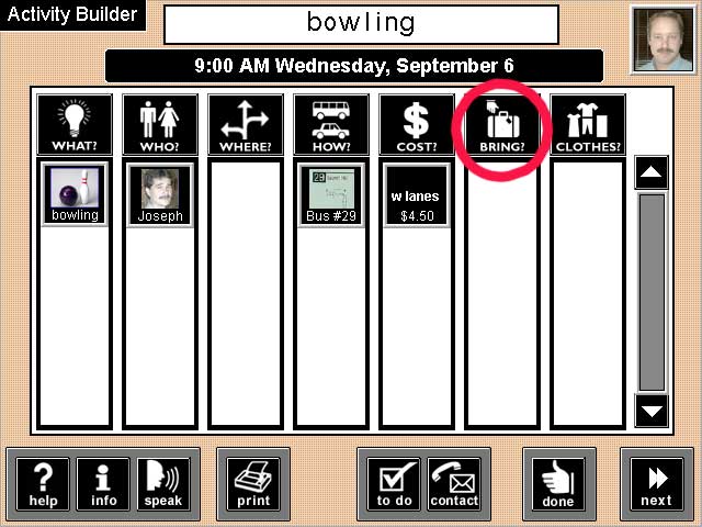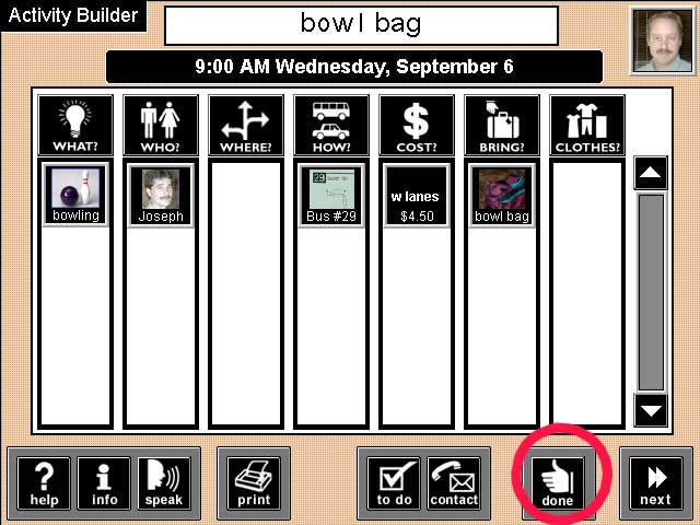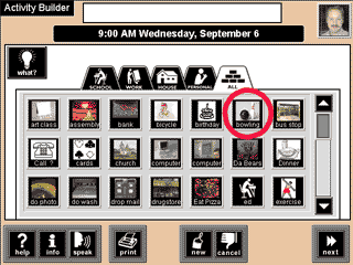 Help > Using > How to Create an ActivityTo create an activity you first click on the time at which to build an activity. Then you answer a series of questions about your activity: What Type of Activity, Who will Go with You, Where the Activity Takes Place, How You'll Get There, How Much it Costs, and What to Bring. Let's go through the process one step at a time. Let's suppose we want to build an activity -- Bowling at 9:00 on Wednesday. First we click on the 9:00 icon on Wednesday. The red circle in the picture below shows where to click. Picture Planner asks whether you'd like to build an activity, as depicted in the screen below. You must click the "Yes" button to continue. Next you select the type of activity by clicking on an icon. If you can't see the icon you want, use the scroll bars on the right hand side of the screen. Picture Planner asks you to confirm that you would like to add bowling. You've successfully created a bowling activity. Now, you can add items to the Who, Where, How, Cost, Bring, and Clothes categories by clicking on one of those buttons. The buttons are highlighted in the image below. For this example, let's add a "Who" item, Joseph. To do this, you click on the Who button at the left-hand side of the red oval below. Click once on Joseph, as highlighted below. As always, Picture Planner asks you to confirm your choice. Click the Yes button. Picture Planner takes you back to the builder, and shows you that you have a bowling activity with Joseph participating. In our example, let's pretend that we'll take Bus 29. To add Bus 29 as a How item, click the How button (as shown below). Now click on Bus #29 to add it as your How item. Picture Planner ask you to confirm the addition of Bus #29. Click the Yes button. Now, let's add the Cost information. Willama Lanes, the local bowling alley, charges $4.50 for shoes & lane fees. Click the Cost button to add this information. Click on the W Lanes icon to add $4.50 as a Cost item. Confirm the Cost of $4.50 for Willama Lanes bowling by clicking the Yes button. Now let's add a Bring item. Click the Bring button, as shown below. To continue our example, let's add a Bring item-- a bowling bag. Confirm that you want to add a Bowling Bag as a Bring item by clicking the Yes button. We're done building our sample activity. To return to the Week View, click the Done button as shown below. Our sample activity shows up as an icon in the Week View. Notice that only the What item, Bowling, is displayed.