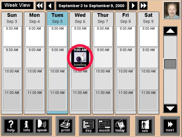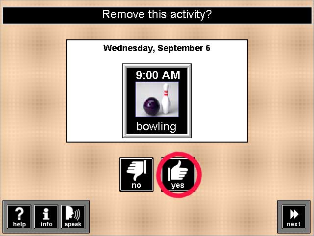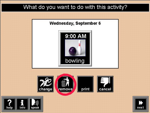 Help > Using > How to Delete an ActivityTo delete an activity, simply click on it in the Day View or Week View, then confirm that you want to delete it. Let's delete the Bowling activity on Wednesday, September 6 at 9:00. First, click on the activity as shown below. Next click the Remove button. Confirm that you want to remove the activity by clicking the Yes button. It is not possible to undo a deletion; once you delete an activity it is gone. When you return to the Week View, notice that the Bowling activity is gone.