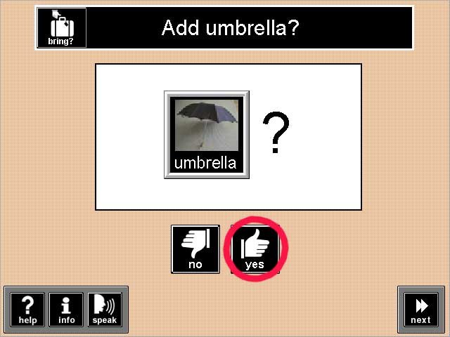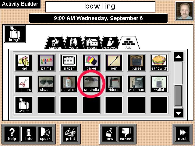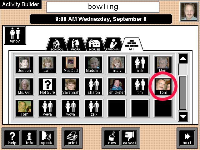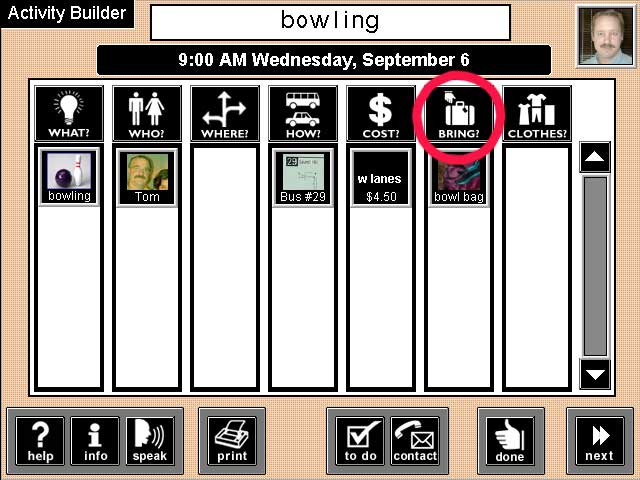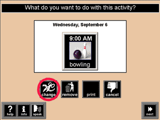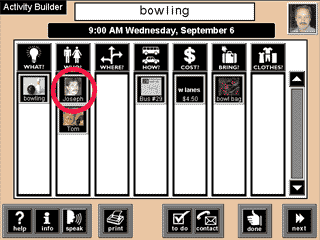Help > Using > How to Edit/Change an ActivityTo edit an activity, simply click on it in the Day or Week View. For this entire tutorial we'll use a red circle or oval to show where to click. Let's edit the Bowling activity that occurs at 9:00 on Wednesday, September 6. Picture Planner ask whats you would like to do with the activity. Click the Change button. For this example, let's pretend that Joseph can't go bowling, but that Tom will go in his stead. Also, the forecast is for rain, so we need to bring an umbrella, so we'll add that to our Bring items. First, let's add Tom. We do that by clicking on the Who button. Next, click on Tom. Confirm that you'd like to add Tom by clicking the Yes button. Now let's delete Joseph. Click on Joseph as shown below. Confirm that you want to delete Joseph by clicking the Yes button. Notice that Joseph has been deleted in the picture below. Now, let's add an umbrella to our Bring items. To do that, click on the Bring button. Add the umbrella by clicking on it. Confirm that you want to add the umbrella by clicking the Yes button. Now we're done changing this activity. Click the Done button to return to the Week View.